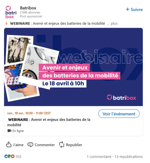 Les résultats obtenus démontrent l’efficacité de notre approche. Entre le 1er janvier et le 30 août 2024, la communauté LinkedIn de Screlec/Batribox a augmenté de 29 %, tandis que leur communauté Facebook a progressé de 7,5 %. L’engagement sur Facebook a bondi de 424 %, atteignant de nouveaux sommets d’interaction. Sur Instagram, nous avons atteint 1 330 000 impressions, tandis que l’engagement sur LinkedIn a progressé de 295 %. Ces chiffres témoignent de l’impact significatif de notre stratégie, qui a non seulement renforcé la notoriété de Screlec/Batribox, mais a également accru leur influence en tant que leader dans la gestion durable des déchets de piles et batteries.